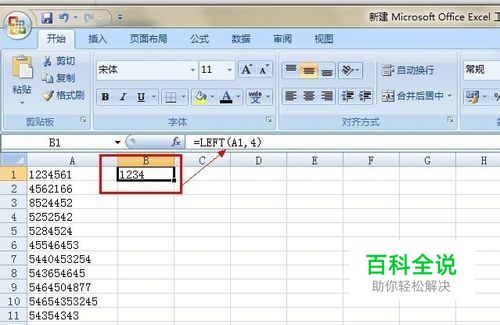 2.在表格里面找一个空白列,输入公式 =left(A2,4) 示例请看图。 公式内容说明: left(单元格,需要左边第几位数字)