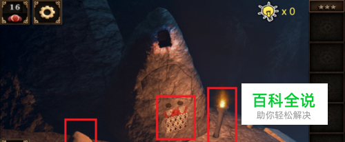 打开暗门进入山洞,在一个竖着的大石头的旁边得到一个小石块,还有一个火把,还有竖着的石头上有个方形的符号,上边有两个原点,代表排序2,之后开箱子会用到。如图所示: