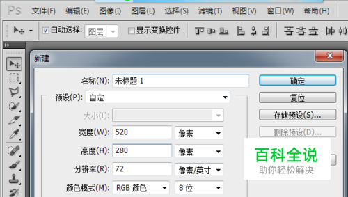 开启PS,新建文件(小编选择的是520px*280px的PC端首焦图片演示,由于位置不同,钻展图片的要求也会有所不同)