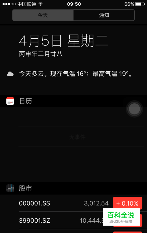 在iphone的任何一屏上至上而下划动屏幕,系统会弹出下拉的窗口,IOS9.3缺省是停留在<今天>的主界面的,如下图所示,在这个窗口选择<今天>右边的<通知>状态栏。
