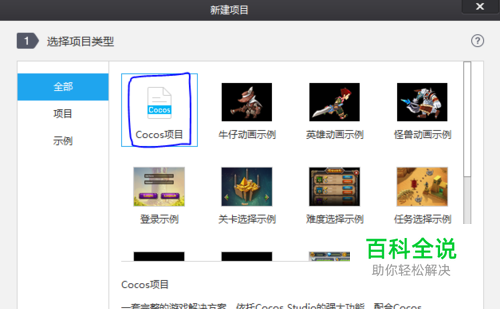 选中“cocos项目”,点击“下一步”。其中有一些实例,大家不妨看看。