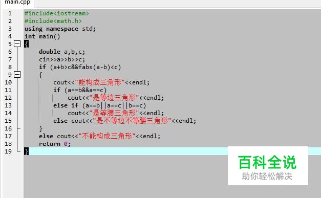 然后我们在C++文件中编写判断三角形的逻辑,主要就是比较三条边的关系,如下图所示