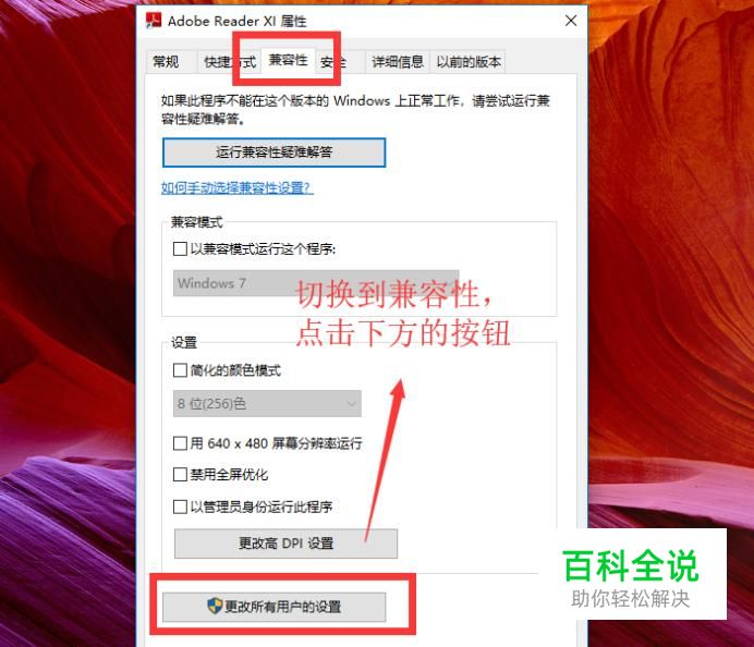 接下来在弹出的软件属性界面中切换到兼容性选项卡页面,然后点击底部的更改所有用户的设置按钮,如下图所示