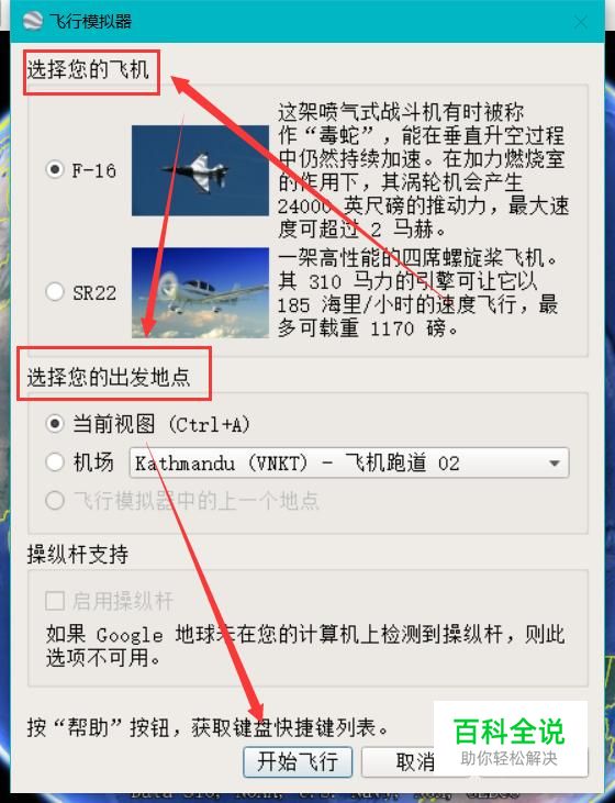在弹出对话框中可以选择飞机和出发地点,选择好后点击“开始飞行”。