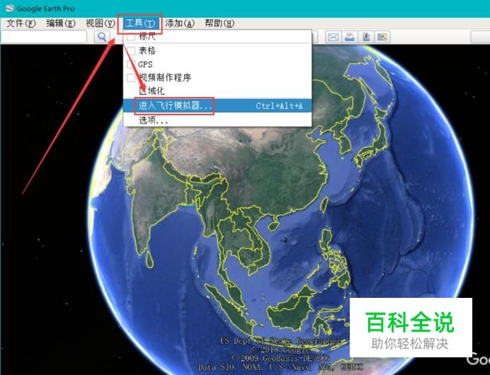 在电脑上面安装“Google Earth”,安装成功后打开,点击菜单栏“工具”下拉列表中的“进入飞行模拟器”。
