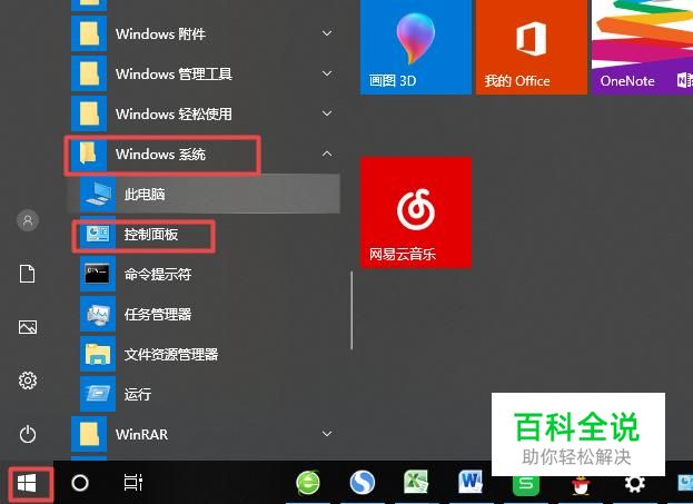 首先,我们点击电脑桌面左下角的微软按钮,弹出的界面,我们点击windows系统,之后我们点击控制面板;