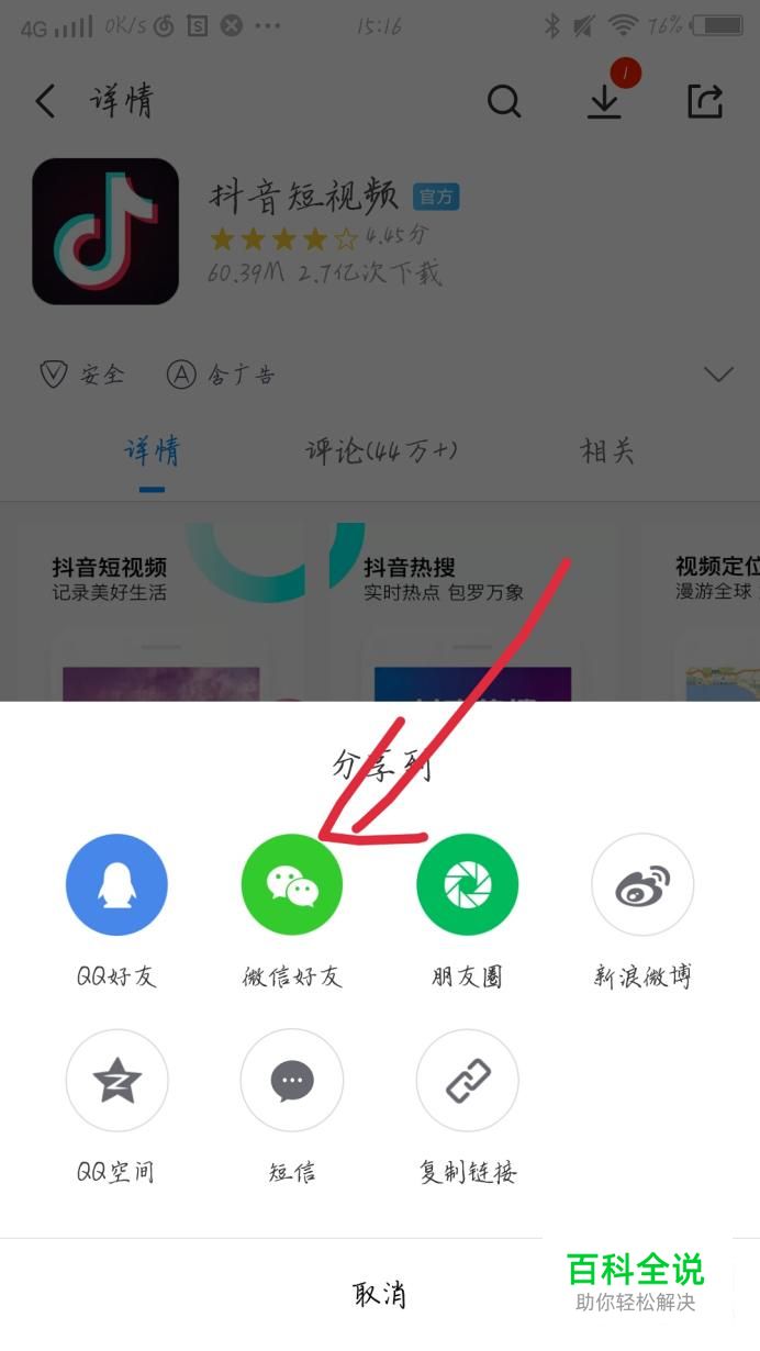点击“微信好友”选项,如图1箭头所示。这样你就可以将抖音分享给好朋友了。