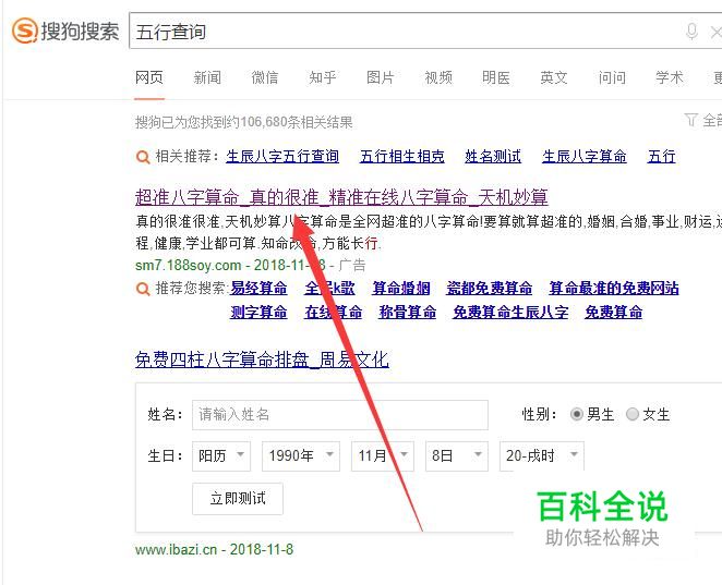 进入之后,搜索“五行查询”,点击并进入,如图所示。