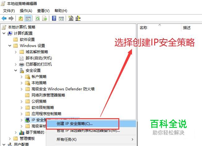 接下来在弹出的本地组策略编辑器中,我们右键单击IP安全策略,选择创建IP安全策略,如下图所示