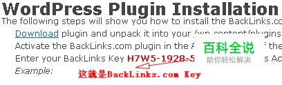 站点程序,我们选择wordpress博客,直接安装插件,下载下插件http://backlinks.com/WordPress/backlinks-wp-plugin-1.1.zip。下载完,安装下,还要再填下BackLinks.com Key。我们在安装这一步,点击安装指南: