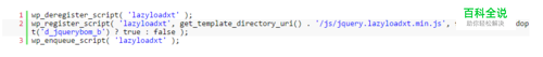 然后导入JS文件 wp_deregister_script( 'lazyloadxt' ); wp_register_script( 'lazyloadxt', get_template_directory_uri() . '/js/jquery.lazyloadxt.min.js', false, '3.0', dopt('d_jquerybom_b') ? true : false ); wp_enqueue_script( 'lazyloadxt' );