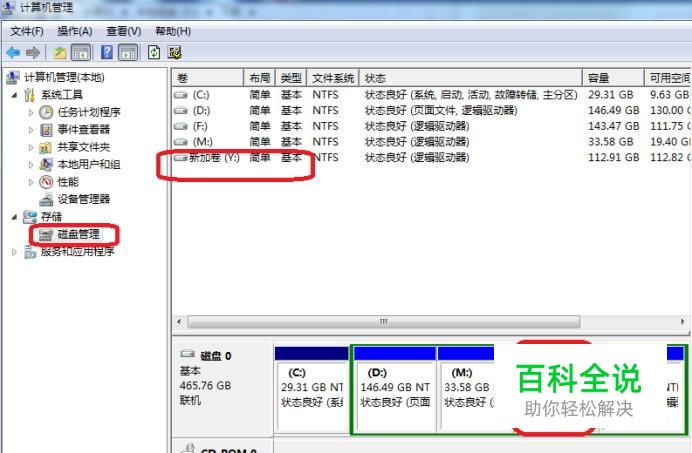 首先,我们打开计算机管理(右键点击计算机,选择“管理”),可以看到分离出来的磁盘Y盘。