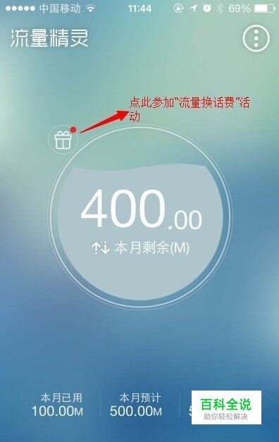 安装并打开流量精灵APP,点开箭头标注的“礼盒”图标,进入兑话费活动界面。