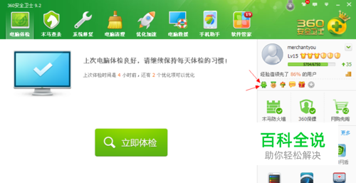 打开安全卫士,在右侧我们可以看到,一个小图标,它就是“安仔小精灵”。不过等级要达到7级才会有这个。
