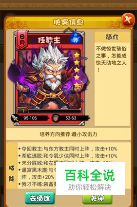 8090比武招亲中任教主是笑傲阵容的一名五星攻击侠客,但是技能却一般。在3.6版本中,任教主可以实现突破,大大提升自己的战力哦。今天我们就来了解下神侠任教主的技能吧。 夺回教主:与东方教主同时上阵攻击+10%;湖底逃脱:与令狐少侠同时上阵,攻击+10%;未分胜负:和左盟主上阵攻击+10%;逼宫黑木崖:与令狐少侠、盈盈、向左使同时上阵攻击+20%;我才不练:装备葵花神功攻击+20%;邪教教主:与洪教主、东方教主、血刀恶僧同时上阵攻击+25%。 突破后技能有:重踏江湖:攻击力增加50000;夺回黑木崖:攻击提升25%;吸星大法:20%几率提升120%攻击。
