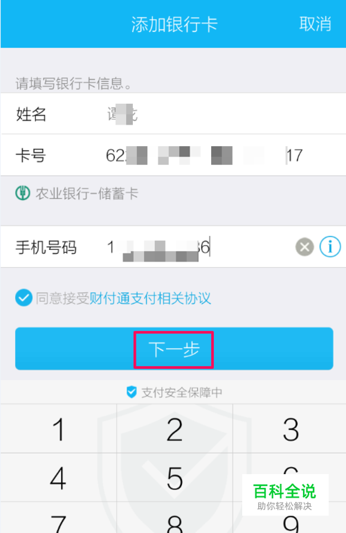 我们写自己的姓名 银行卡账号输入手机号码点击下一步 如图