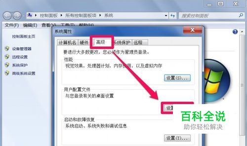 进入系统属性窗口,这一回,需要选择“高级”这个选项卡,然后在其界面下,选择“用户配置文件”这一项,点击其“设置”按钮。