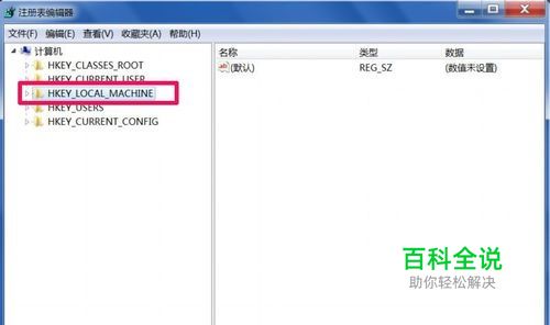 进入注册表编辑器窗口后,先在五个注册表根键中,选择需要进入的根键[HKEY_LOCAL_MACHINE],这一根键存储的是系统软件与硬件的配置。