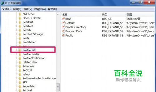 然后以这个根键为开始,依次打开[HKEY_LOCAL_MACHINE\SOFTWARE\Microsoft\Windows NT\CurrentVersion\ProfileList]这一路径,最后选定于ProfileList这一项,即配置文件列表。