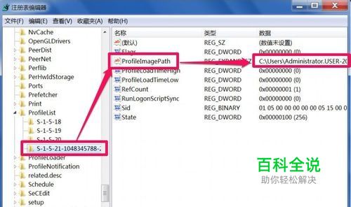 打开ProfileList的子项,在下面,有以S-1-5开头的子项,依次选择,然后在右侧窗口找到“ProfileImagePath”这一项,看看其后的值,是不是自已的用户帐号。