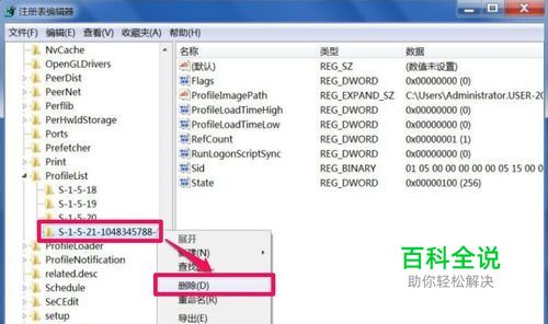 如果右侧的值是你的登录帐号,然后回到左侧,在此项上右键,选择“删除”,将这一个项删除掉,然后退出注册表,重启电脑登录,电脑会重新创建新的配置。