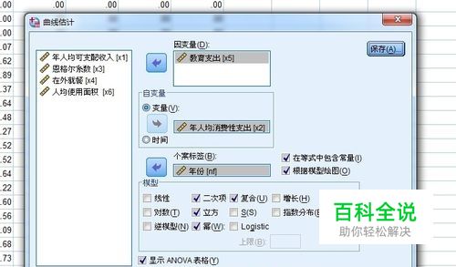 操作见图片,仅观察拟合优度,三次曲线最高,接着是二次曲线,但是通过观察方差分析和回归系数的显著性检验知,三次曲线的回归系数不显著,计算出的概率值为0.173、0.304,均大于显著性水平,所以三次曲线模型不可用。 二次曲线中的“ 年人均消费性支出”的系数为 -0.148,负数与实际情况不符合,所以排除此模型。
