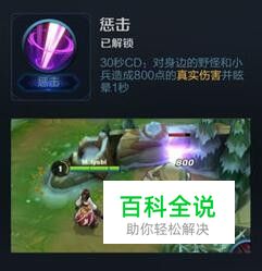 【召唤师技能】惩击 作为打野英雄惩击是必不可少的,可以加快清野的速度。打野刀升级后的寒冰惩击对英雄的真实伤害以及减速效果可以在逃跑或追击是起到出其不意的效果。