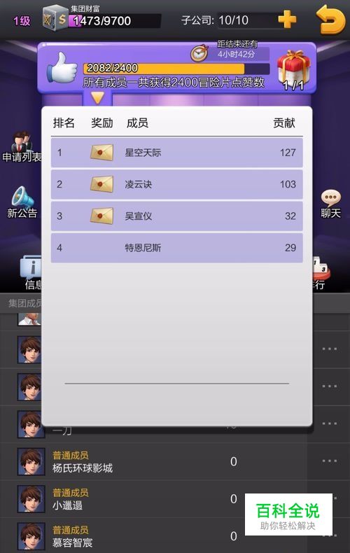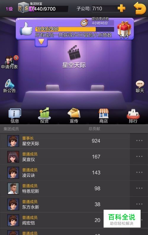 获得点赞数就可以返回集团查看有没有你的名字和贡献,如果没有就等一下就会更新的,然后继续刷冒险片电影去完成今天的任务。