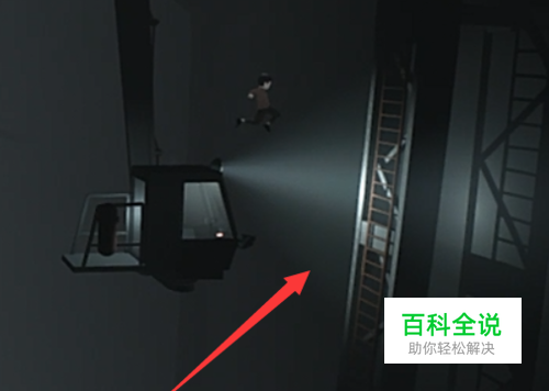 随后跳到如图所示的楼梯上面抓稳了,再往下走,就到达风扇区域了。