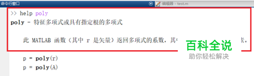 第二步我们可以看一下poly函数的使用方法,在命令行窗口中输入“help poly”,如下图所示: