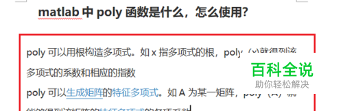 第一步我们首先需要知道matlab中poly函数可以构造多项式,也可以生成矩阵的特征多项式,poly(a)可以得到特征多项式各项系数,详细介绍如下图所示: