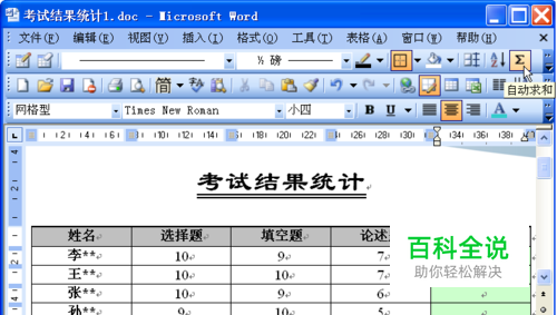 打开word文件,将光标定位在“合计”列下方的第1个单元格中,然后单击【表格和边框】工具栏中的【自动求和】按钮,即可计算出合计数值26。