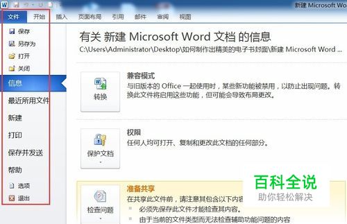 信息命令:信息命令包括四个子命令,首先可以看到文件的储存路径,然后是【兼容模式】命令,如果文档不兼容,可以点击此命令试一试,不过唯一缺陷是可以会导致文档布局更改。【权限】命令包括五个子命令,可以设置文档的权限,用于保护文档的内容和编辑权限。【准备共享】命令也叫【检查命令】用于检查不可以共享的内容。【版本命令】用于恢复未保存的文档。在信息命令的五个子命令的右方,显示当前文档的相关信息。