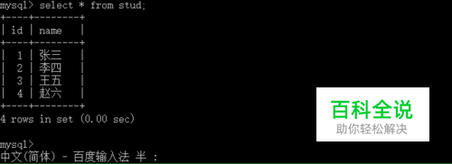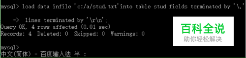 --将stud.txt中的文件导入到数据库中 mysql> load data infile 'c:/a/stud.txt'into table stud fields terminated by '\,' lines terminated by '\r\n'; --查看导入的数据 mysql> select * from stud;
