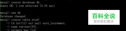 --创建数据库 db mysql> create database db; -- 使用db数据库 mysql> use db --创建stud表 mysql> create table stud( -> id int(11) not null auto_increment, -> name varchar(30), -> primary key (id) -> )engine=innodb auto_increment=1 default charset=utf8;