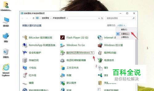 查看方式:大图标。单击备份和还原(Windows 7)。