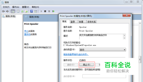 找到并双击“Print Spooler”服务,单击“停止”。