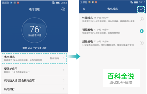 手机管家应用,隐藏着好多省电招数哦,点击【手机管家】>【剩余N%】(电量管理),点击【省电模式】,然后选择合适的省电模式。建议您在日常应用的时候选择【智能省电】,在电池电量较少的时候选择【超长待机】。