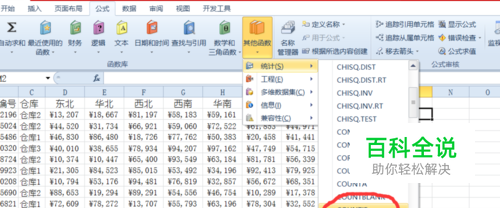 单击“其他函数”下的小三角符号,打开下拉菜单,选择“统计”选项,再在“统计”的下拉菜单下找到“COUNTIF”函数。