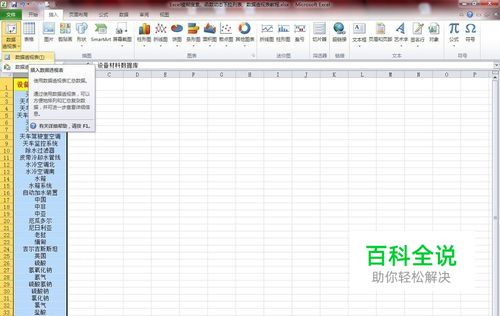 打开Excel文件,如下图所示 这里我们需要存储的批量材料物品清单在A列,操作选中A列、插入、数据透视表