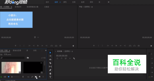 打开pr ,在素材文件框底部点击新建素材箱并将其命名为“素材箱1”。
