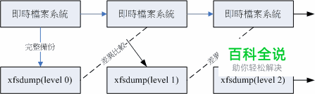 XFS 文件系统备份 xfsdump 其实 xfsdump 的功能颇强!他除了可以进行文件系统的完整备份 (full backup) 之外,还可以进行累积备份 (Incremental backup) 喔! 啥是累积备份呢?这么说好了,假设你的 /home 是独立的一个文件系统,那你在第一次使用 xfsdump 进行完整备份后,等过一段时间的文件系统自然运作后, 你再进行第二次 xfsdump 时,就可以选择累积备份了!此时新备份的数据只会记录与第一次完整备份所有差异的档案而已。 看不懂吗?没关系!我们用一张简图来说明。