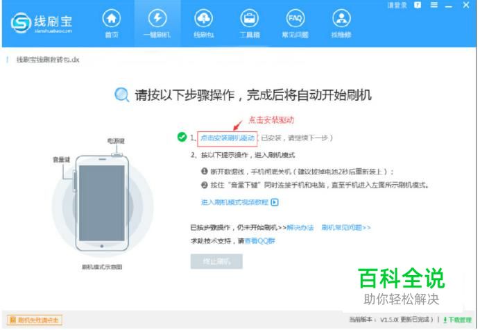 线刷宝在解包完成后,会自动跳转到刷机端口检测页面,在刷机端口检测页面点击“点击安装刷机驱动”。