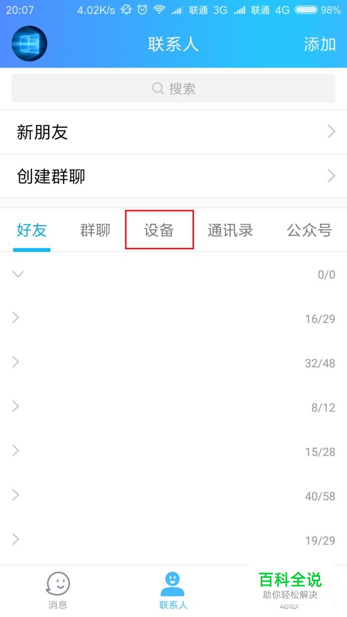 首先,打开手机QQ主页面,点击联系人页面中的“设备”菜单项。