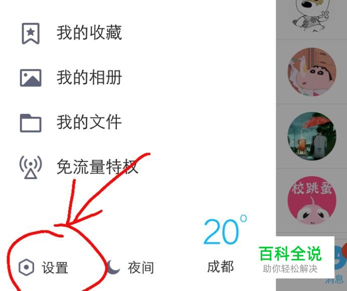 首先点开手机QQ,划到左方,看到设置一看,点击设置。