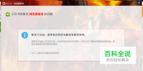 最后我们看到提示修复已经完成,我们重新启动电脑即可生效。如图所示;