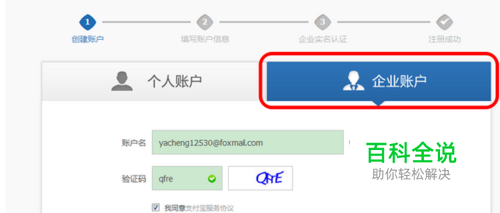 2、在“创建账号”页面,选择企业账号。然后输入邮箱名(邮箱名就是新注册的支付宝帐号名称)等信息,点击“下一步”。