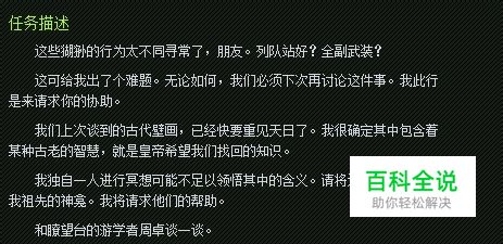 任务描述 这些猢狲的行为太不同寻常了,朋友。列队站好?全副武装? 这可给我出了个难题。无论如何,我们必须下次再讨论这件事。我此行是来请求你的协助。 我们上次谈到的古代壁画,已经快要重见天日了。我很确定其中包含着某种古老的智慧,就是皇帝希望我们找回的知识。 我独自一人进行冥想可能不足以领悟其中的含义。请将这个传家宝带到我祖先的神龛。我将请求他们的帮助。 和瞭望台的游学者周卓谈一谈。 奖励: 980经验奖励: 111000 XP ( 或者获得 93350 @ 等级 90 )