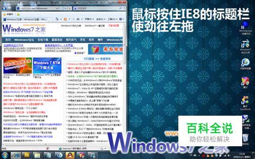 你瞬间就能完成窗口截图抓取动作,并能一键清除桌面 由于宽屏显示器变得越来越普遍,更容易得并行窗口管理变得越来越关键---而Windows搭载了这样的功能。虽然不像第三方程序GridMove的可配制型那么强,不过 Windows 7提供一个非常好用的功能---你只需要将目标窗口拖放到屏幕左边或右边,你就能得到相当于一半屏幕大小的该窗口的截图。下图就显示了这样一个过程:放开你的鼠标按钮,你就会得到一个一半屏幕大小的IE8浏览器窗口截图。 同样,新的“航空抖动(Aero Shake)”功能能够让你通过抓住活动窗口的顶端栏并来回迅速移动,从而清除所有的桌面背景窗口抢夺。