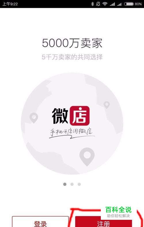 下载完成后打开微店,进入下图页面,点击页面上的“注册”。